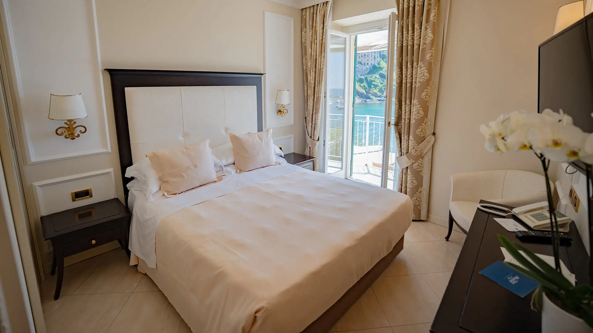 Camera elegante, confortevole e rinnovata, affacciata direttamente sulla spiaggia della Baia del Silenzio, con terrazza privata.