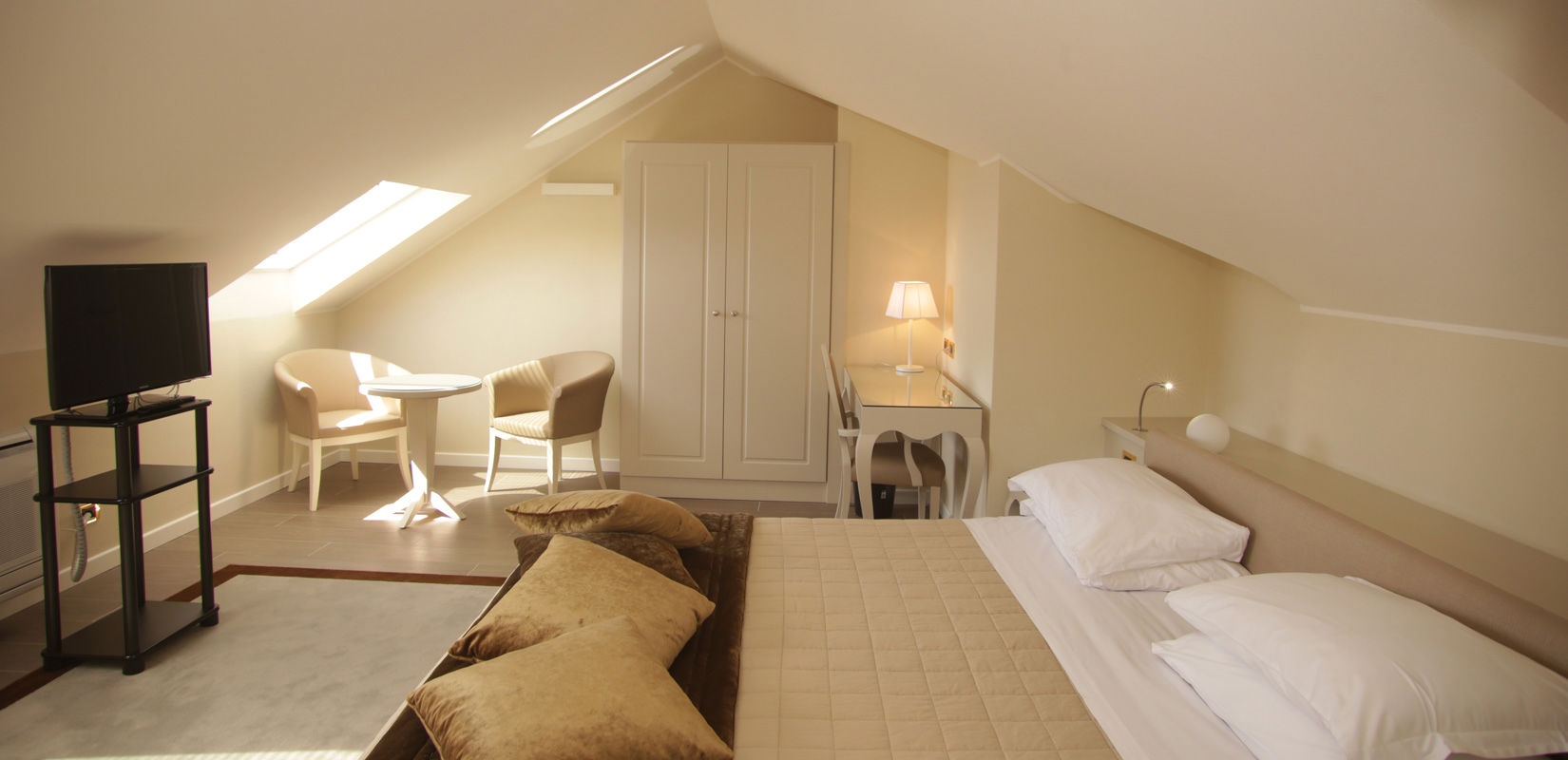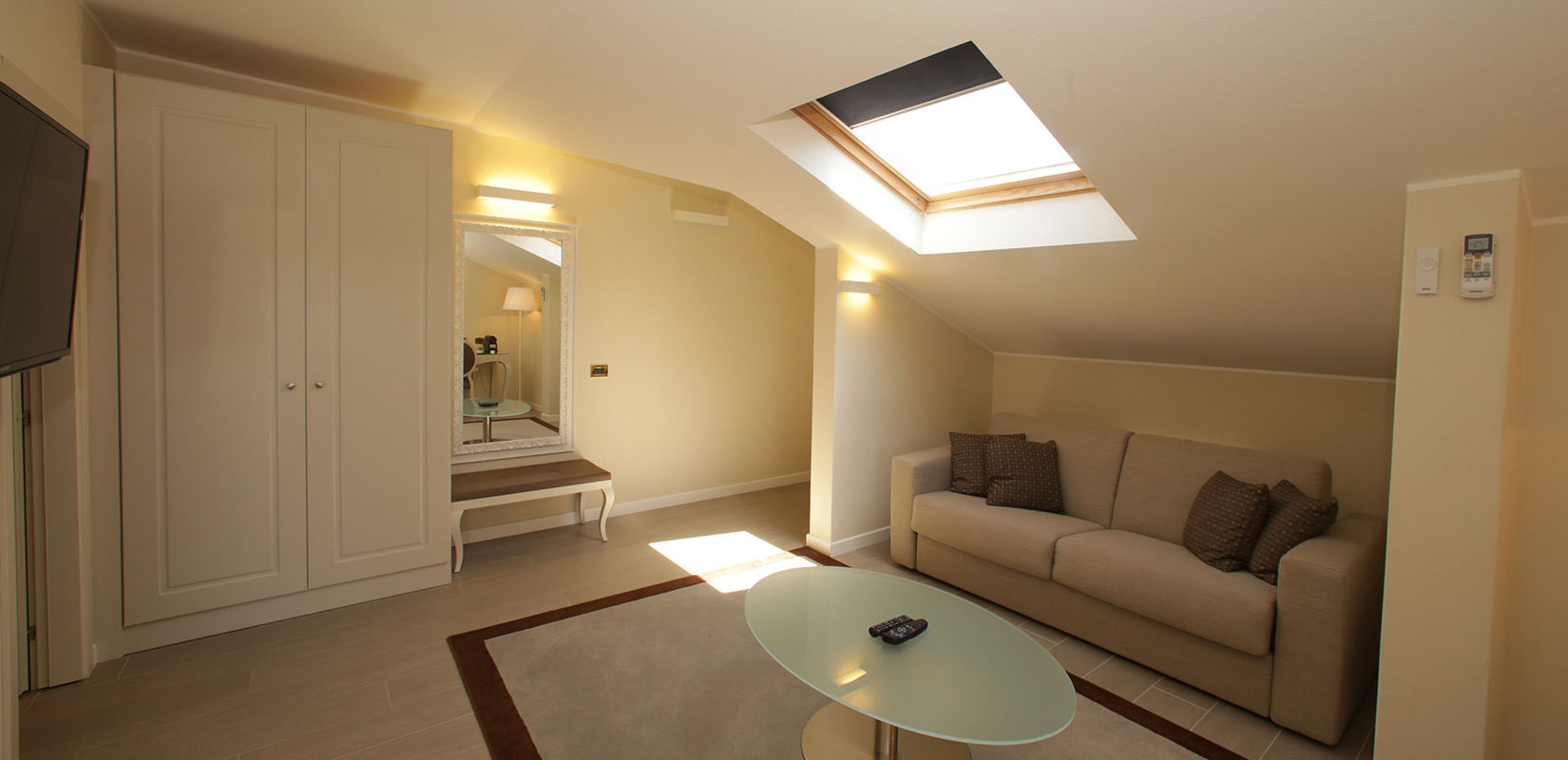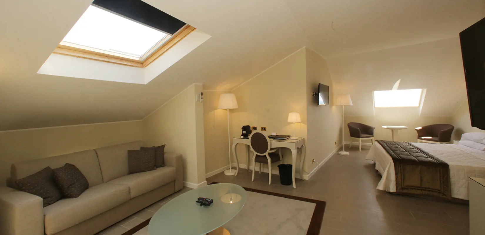 Situata al 4° e ultimo piano dell’Hotel, mansardata, la Suite è dotata di tutti i comfort: letto matrimoniale king size, zona soggiorno con divano letto matrimoniale, bagno con maxi-doccia, minibar, televisori, aria condizionata/riscaldamento, servizio in camera compreso.